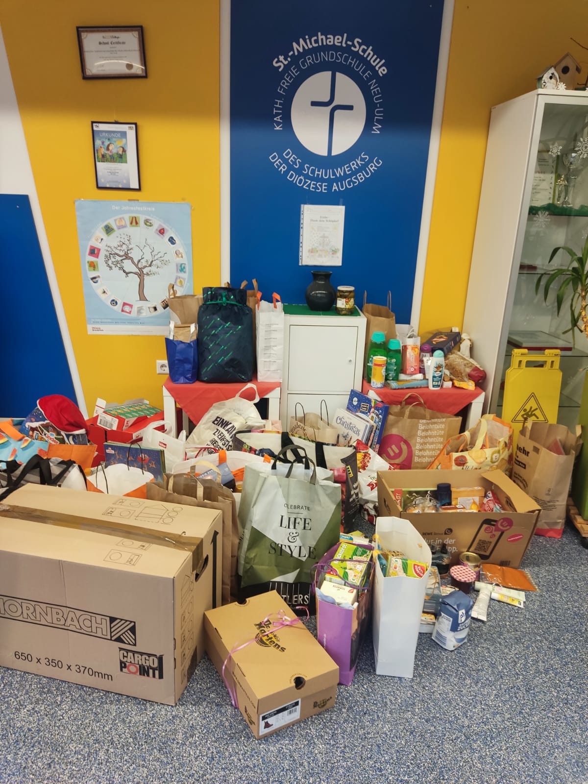 Die Kinder durften im Eingangsbereich unserer Schule ihre Sachspenden abgeben. Jeden Morgen sah man, dass die Anzahl stetig zunahm.