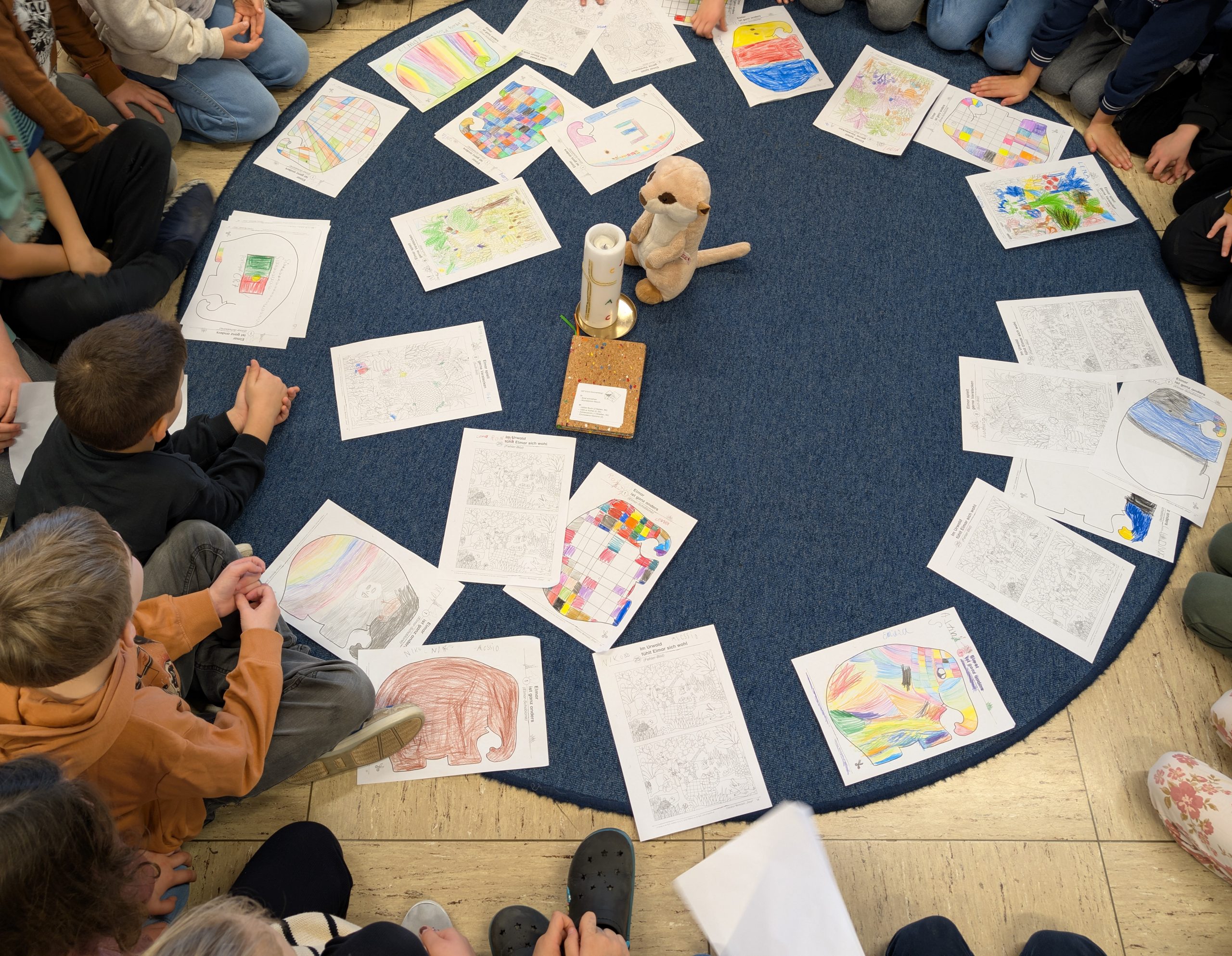 Passend zu der dunklen Jahreszeit und der nun kommenden Adventszeit überlegten sich die Kinder der Klasse 1a im Morgenkreis, wie man die Welt ein bisschen heller machen kann. Dabei entsand folgendes wunderschöne Bodenbild: